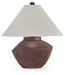 Details Made of polyresin with empire hardback fabric shade, Antiqued red-brown finish, On/off inline switch, 1 E26 socket, type A bulb recommended (not included); 100 watts max or LED equivalent; UL Listed, Minor assembly required; simply attach preassembled shade to lamp base