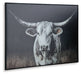 Add homespun charm to modern farmhouse and casual spaces. A longhorn cow takes center stage in this wall art, its white coat contrasting beautifully against the dark background tones. A sleek black frame completes the look.