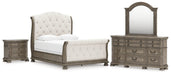| Details | B944B2: Includes upholstered sleigh headboard, upholstered sleigh footboard, sleigh rails and slats, Made with solid wood frames, solid wood blocking and foam, Light brown finish with glazed antiqued look , Polyester upholstery, Aged bronze-tone nailhead trim, Foundation/box spring required, sold separately, Mattress available, sold separately, Assembly required, B944B1: Includes dresser and mirror, Made with hardwood solids, oak and ash veneer, MDF substrates and cast resin components , Top with inlaid ash veneer border, Light brown finish with glazed antiqued look , Metal hardware with aged bronze-tone finish , 9 drawers with fully finished interior, dovetail construction and heavy duty ball-bearing side glides, Mirror attaches to back of dresser, B944-93: Made with hardwood solids, oak and ash veneer, MDF substrates and cast resin components, Top with inlaid ash veneer border, Light brown finish with glazed, antiqued look, Metal hardware with aged bronze-tone finish, 3 drawers with fully finished interior (top drawer felt lined), dovetail construction and heavy duty ball-bearing side glides, 110V power supply with USB-A and USB-C charging ports, Power cord included; UL Listed, | |