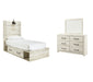 Details B192B1: Includes dresser with mirror, Made of engineered wood (MDF/particleboard) and decorative laminate, Wispy white finish over replicated oak grain with authentic touch, 6 smooth-gliding drawers, Drawer interiors are lined with a faux linen laminate for a clean, finished look, Large-scale hardware with dark finish, Mirror attaches to back of dresser, Assembly required, B192B21: Includes headboard, footboard, side storage, rails and slats, Made of engineered wood (MDF/particleboard) and decorative laminate, Wispy white finish over replicated oak grain with authentic touch, Large-scale hardware with dark finish, Decorative sconce light, LED with 3 AA batteries, 4 smooth-gliding storage drawers, 4 storage cubbies, 2 slim-profile USB charging ports, Power cord included; UL-listed, Bed does not require additional foundation/box spring; accommodates most zero clearance adjustable bases with the addition of a bunkie board, Mattress available, sold separately, Assembly required,