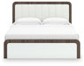 Looking to make a subtly striking statement in your bedroom? We've got you covered. This king upholstered bed’s sophisticated two-tone treatment marries a warm brown finish over replicated walnut grain with a white finish. Highlighted with a wonderful white faux leather, the headboard features warm ambient lighting for that cozy feeling we all love at bedtime. Rounded corners radiate an air of modern panache. It’s a master class in contemporary yet comfortable character.