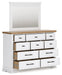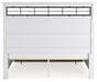 | Details | B844B4: Includes panel headboard, storage footboard, rails and roll slats, Footboard made with hardwood solids, MDF substrates and butcher block oak veneer, Headboard and rails made with hardwood solids and MDF substrates, White finish, Headboard with inset black metal barn sash, 2 drawers in footboard with fully finished interior, dovetail construction and ball-bearing side glides, Pulls with matte black finish, Bed does not require a foundation/box spring, Mattress available, sold separately, Assembly required, B844B1: Includes dresser and mirror, Made with hardwood solids, MDF substrates and butcher block oak veneer, Dresser with 2-tone finish (white finish; butcher block oak veneer with natural finish), Pulls with matte black finish, 10 spacious drawers with fully finished interiors (top drawers felt lined), dovetail construction and ball-bearing side glides , Drawers with inset picture fronts, Mirror attaches to back of dresser, | |