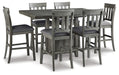 Details D589-42: Made with hardwood solids, select acacia veneer and engineered wood, Antiqued gray finish, Storage base, Removable leaf, Seats up to 6, Assembly required, D589-124: Made with solid wood, Antiqued gray finish, Upholstered in gray textural polyester fabric, Cushioned foam seat, Contoured comb-back design, Assembly required,