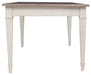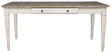 Set the scene for coastal chic or modern farmhouse living with this dining room table. Clean-lined, simply striking table doubles the charm with a brown tone top with plank effect, paired with a grayish white base with rub through effect for timeworn appeal. Multi-functional dining table features two convenient side drawers and a storage bin on each end for maximum use of space. Styled to comfortably seat six, this table makes room for one and all.