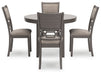 | Details | Includes dining table and 4 upholstered chairs, Table made with rubberwood solids, mindi veneer and MDF substrates, Chair made with solid wood and engineered wood, Light gray finish, Chair with light gray textured polyester upholstery, Foam cushioned seat and backrest, Chair backrest features fretwork accent, Tabletop has reverse diamond patterned veneer, Thick tapered legs, Lower shelf, Seats up to 4, Assembly required | |