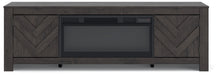 This TV stand with electric fireplace embraces a classically charming aesthetic and repurposes it for modern living. Its dark charcoal finish appeals to your love of vintage character, while a chic chevron pattern is effortlessly on trend. Media accessories stay tucked away in style thanks to hidden storage behind the doors. And for added ambiance, the electric fireplace brings a cozy-cool vibe to your living room. With the touch of a button, activate the LED-lit flame and adjust the temperature or the flame brightness. The flame effect includes multiple color options and a realistic-looking faux birch log set.
