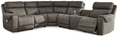 Details ONLY AVAILABLE AS PICTURED. Includes 6 pieces: left-arm facing power recliner, power armless recliner, armless chair, wedge, console and right-arm facing power recliner, "Left-arm" and "right-arm" describe the position of the arm when you face the piece, One-touch power control with adjustable positions, Easy View™ adjustable headrest, power lumbar support and zero-draw USB plug-in, Corner-blocked frame with metal reinforced seat, Attached back and seat cushions, High-quality foam cushions wrapped in poly fiber, Faux leather upholstery, Pop-out cup holders, Console with touchscreen, Wireless audio; headphone accessible, 110V power supply with USB charging ports, Power cord included; UL Listed