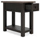 | Details | Made of wood, white oak veneers and engineered wood, Weathered grayish brown top, Textured wire brushed base in a black rub-through finish, Chairside end table features plank-styled top, Smooth-gliding drawer perfect for holding remotes and more, Integrated 110V power supply with dual USB charging ports, Black faceted hardware, Assembly required | |