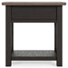 Quality crafted and richly styled, this rectangular chairside end table is sure to charm. Its two-tone aesthetic pairs a weathered grayish brown tabletop with a textured wire brushed base in black. A built-in shelf offers handy display space. And the table's integrated 110V power supply and dual USB charging ports make it so easy to keep your personal devices powered up.