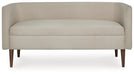 Details Polyester upholstery, Wood legs with brown finish, Attached seat cushion, Curved back, Minor assembly required, simply lay flat and attach feet