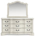 | Details | Includes dresser and mirror, Made with hardwood solids, spruce veneer, MDF substrates and cast resin components, Antiqued white painted finish, 9 drawers with fully finished interiors, French and English dovetail construction and ball-bearing side glides, Metal bar pulls with aged pewter-tone finish, Mirror attaches to back of dresser | |