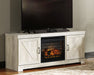 | Details | Includes TV stand and electric fireplace insert (W100-101), Made with engineered wood (MDF/particleboard), Antiqued white finish over replicated oak grain, 2 storage cabinets (each with an adjustable shelf), Removable/adjustable center shelf, Cutouts for wire management and ventilation, Electric fireplace insert provides up to 5,386 BTU/1,500W and warms up to 1,000 square feet (heats larger rooms), 7-level temperature setting; 5 levels of flame brightness, LED-lit multi flame display operates with or without infrared heat; realistic-looking log set with dynamic glowing embers, Remote control with LED display, Timer function with programmable ranges from 10 minutes to 9 hours; overheating control device, Power cord included; UL Listed, Assembly required; simply remove the center shelf and back panel to make room for the fireplace insert | |