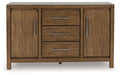 Define your dining room with reliable function and style. This dining server sits comfortably at the intersection of modern lodge and farmhouse aesthetics. Charming architectural elements and a light brown glazed finish reflect your warm and welcoming disposition. Even with its poise, it remains practical, serving up plenty of storage space in its dual cabinets and spacious drawers.