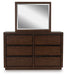 Casual contemporary styling with a decidedly modern vibe. This dresser with mirror is warm and inviting with a rich dark brown finish, adorning your restful retreat with on-trend elegance. Full-length metal pulls in a matte black finish add a subtly cool touch to spacious storage drawers. What a simply stunning way to achieve the bedroom of your dreams.