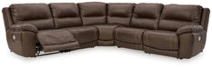 Load up on comfort in a cool, clean-lined and contemporary way with this power reclining sectional in chocolate brown. Rest assured, the expertly matched leather and faux leather upholstery is enriched with a pebble grain effect for authentic appeal and enhanced with jumbo stitching for dramatic contrast. It features a one-touch power control with adjustable positions, along with an Easy View™ adjustable headrest that allows a primo view of the TV even when you're reclined. Extended ottomans provide extra length for leg comfort. A zero-draw USB plug-in at your fingertips lets you charge up as you chill out.
