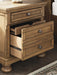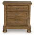A relaxed take on casual traditional design, this nightstand strikes a comfy pose with a classic sensibility. Its timeless design and chestnut brown wood tone create a welcoming retreat tailored to your laid-back lifestyle. Metal knobs in an aged pewter color subtly dress up framed inset drawers that store nighttime essentials. A hidden pull-out tray behind the bottom drawer keeps your small valuables out of sight.