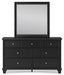 | Details | Includes dresser and mirror, Made with hardwood solids, birch veneer and MDF substrate, Black painted finish, 7 smooth-gliding drawers with dovetail construction and ball-bearing side glides, Round metal drawer knobs with satin nickel-tone finish, Framed drawer fronts, Tapered feet, Mirror attaches to back of dresser, Assembly required | |