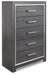 | Details | Made of engineered wood (MDF/particleboard) and decorative laminate, Gray finish with replicated wood grain, Faceted chrome-tone pulls and accents, 5 smooth-operating drawers, Drawer interiors are lined with a faux linen laminate for a clean, finished look, Safety is a top priority, clothing storage units are designed to meet the most current standard for stability, ASTM F 2057 (ASTM International), Drawers extend out to accommodate maximum access to drawer interior while maintaining safety | |