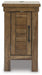 | Details | Made with acacia wood solids, veneer and MDF substrate, Tobacco brown finish, Antiqued bronze-tone hardware, Single cabinet door, 110V power supply with dual USB ports, Power cord included; UL Listed | |
