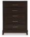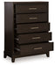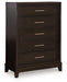 | Details | Made with hardwood solids, engineered wood and MDF substrates, Grayish brown wood-tone finish, Metal bar pulls with satin nickel-tone finish, 5 smooth-gliding drawers with dovetail construction and heavy duty ball-bearing side glides (top drawers felt lined) | |