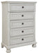 Elegant, timeless furnishings take your bedroom to the next level. Nothing does that better than this chest of drawers. The antiqued white finish with a wonderful grain texture radiates sophistication, while dark bronze-tone knobs add an ornate touch. Felt finishing in the upper drawers rounds out this tasteful piece.