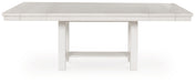 | Details | Made with rubberwood solids, ash veneer and MDF substrates, Antiqued white finish with grain texture, Tabletop with planked effect, Two 12" removable center leaves, Table extends to 86" overall by pulling both ends and dropping in leaves, Seats up to 8, Assembly required | |
