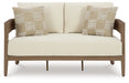 Elevate the appeal of easy-breezy living with this outdoor loveseat. Made to look like wood yet durable enough to weather the elements, it's sure to serve you and your besties well, year after year. The gently curved piece features cushions wrapped in Nuvella+™ high-performance fabric for plush refinement. Patterned accent pillows infuse delightful texture.