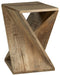 This accent table puts a new twist on vintage casual. Its brown finish is delightfully distressed, drawing attention to the saw mark planks arranged in an open architectural design. Place this unique piece next to a cozy chair to create a charming reading nook overflowing with visual intrigue.