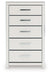 | Details | Made with engineered wood (MDF/particleboard/plywood) and decorative laminate for the right balance of affordability and durability, Matte white finish with subtle replicated wood grain, Decorative laminate replicates natural or man-made material surfaces with consistent color, pattern and texture, Chrome-tone accents, Large-scale chrome-tone handles with faceted details, 5 smooth-gliding drawers, Drawer interiors are lined with a faux linen laminate for a clean, finished look, Safety is a top priority, clothing storage units are designed to meet the most current standard for stability, ASTM F 2057 (ASTM International), Drawers extend out to accommodate maximum access to drawer interior while maintaining safety, Minor assembly required | |